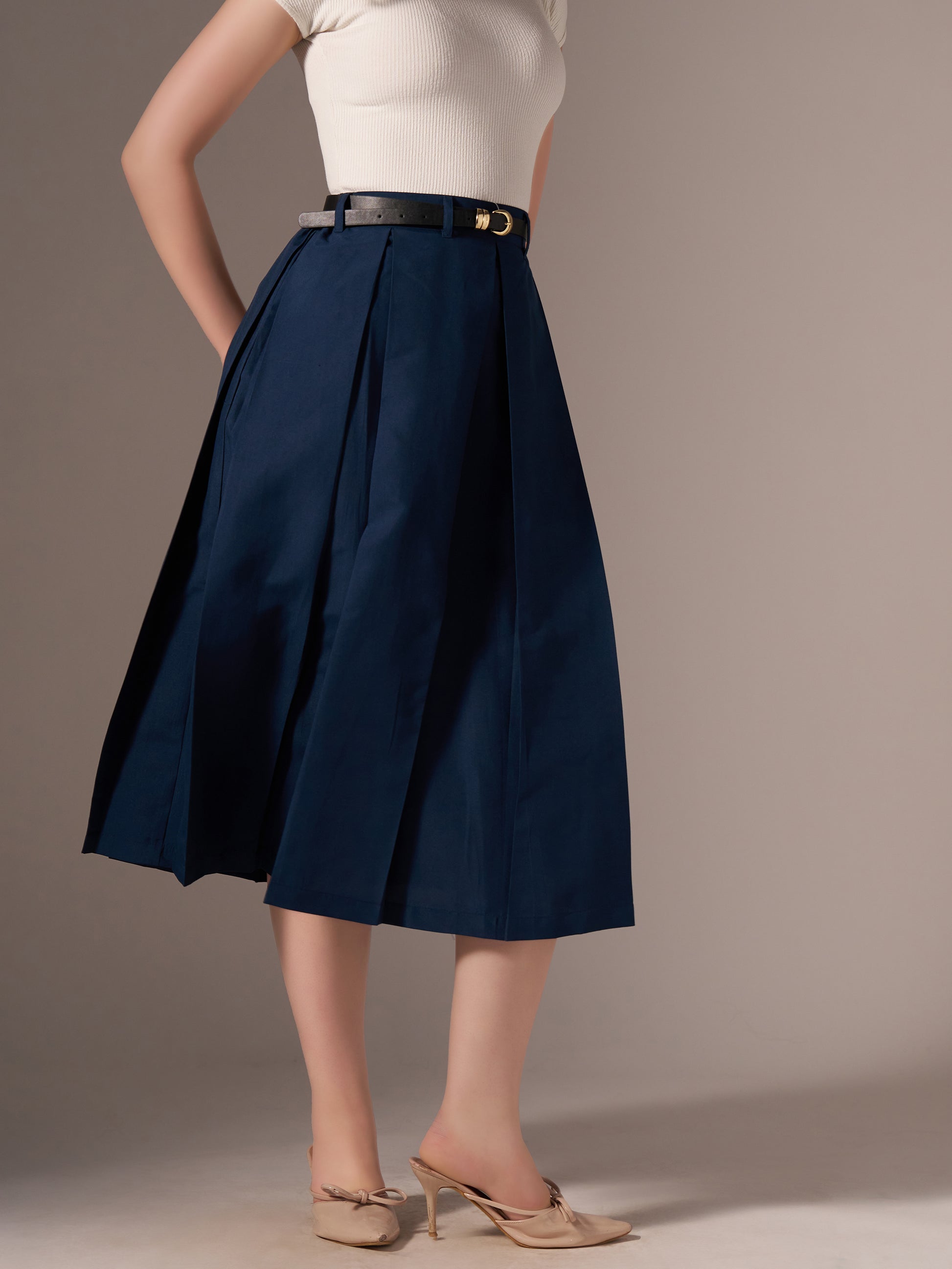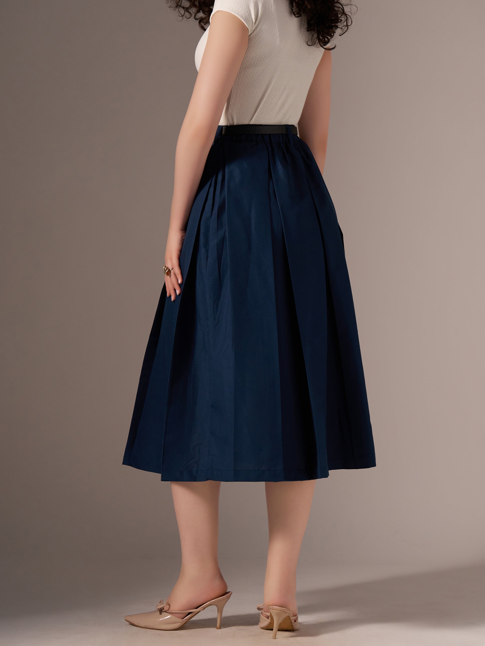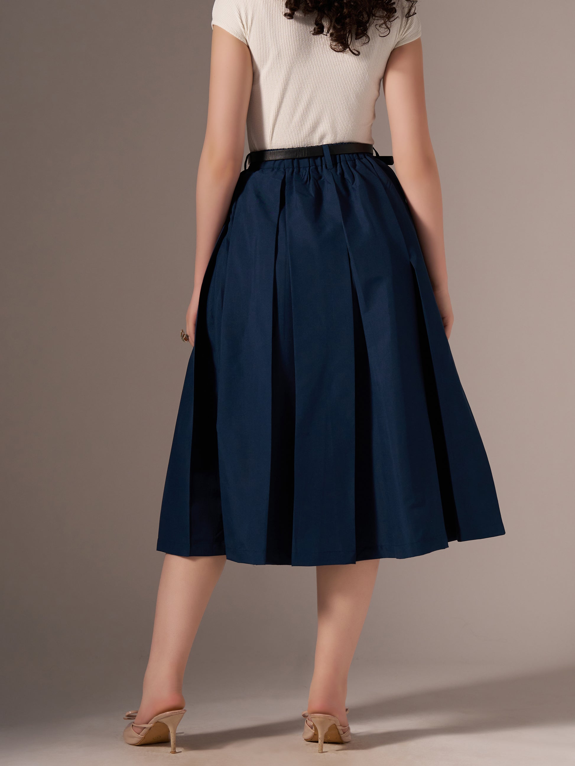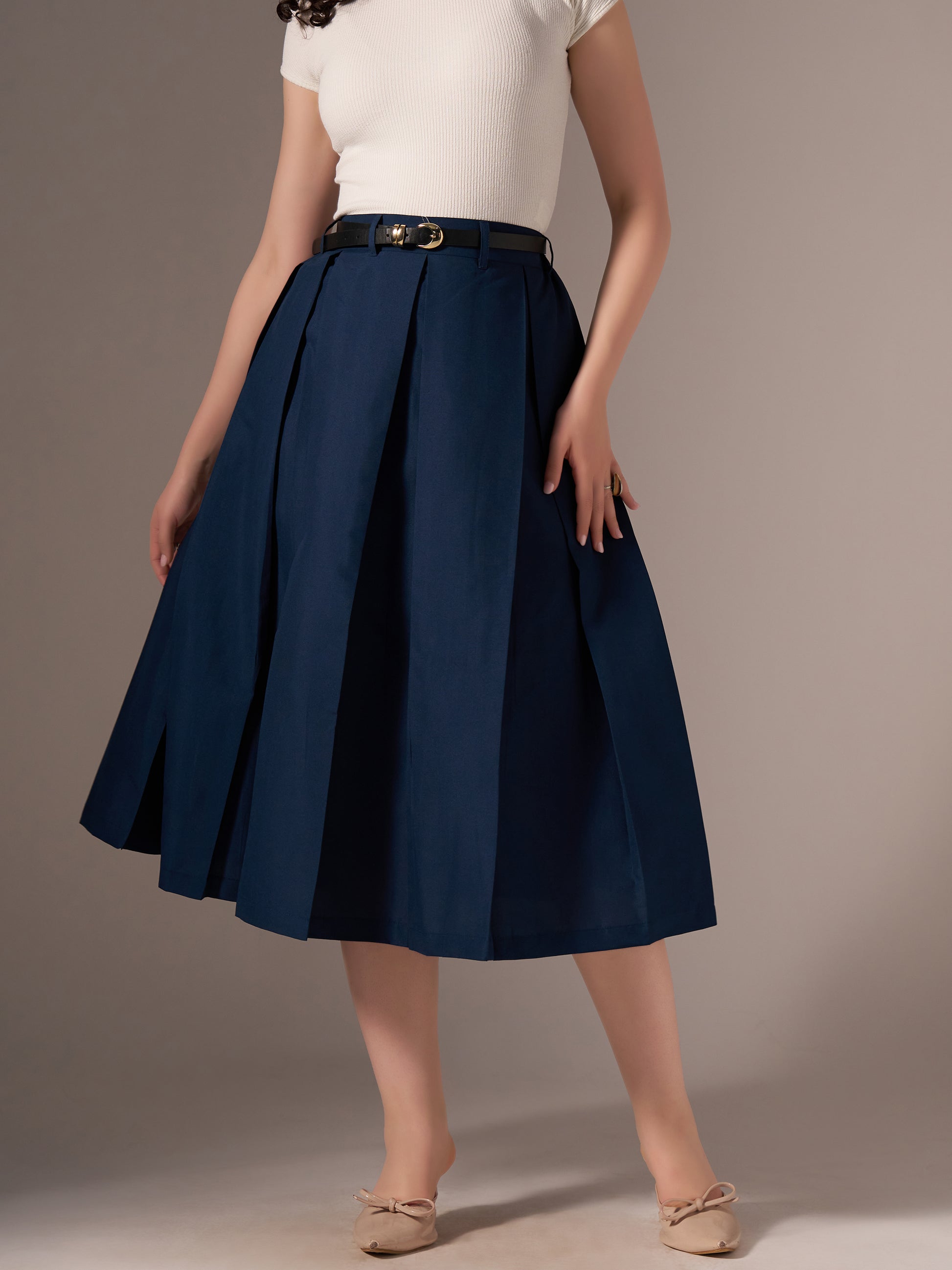 Cotton Midi Flared Pleated Skirt With Belt Loop