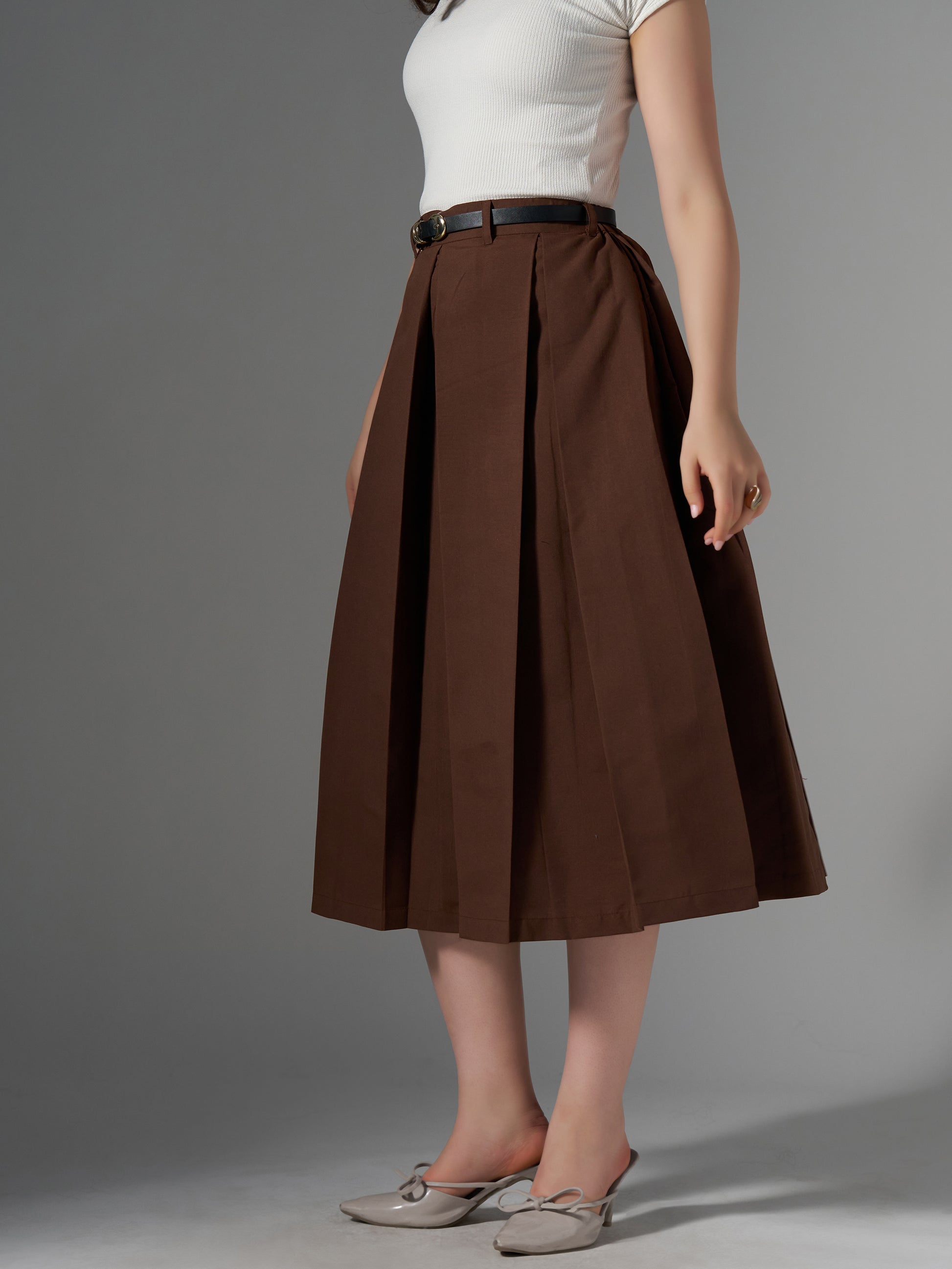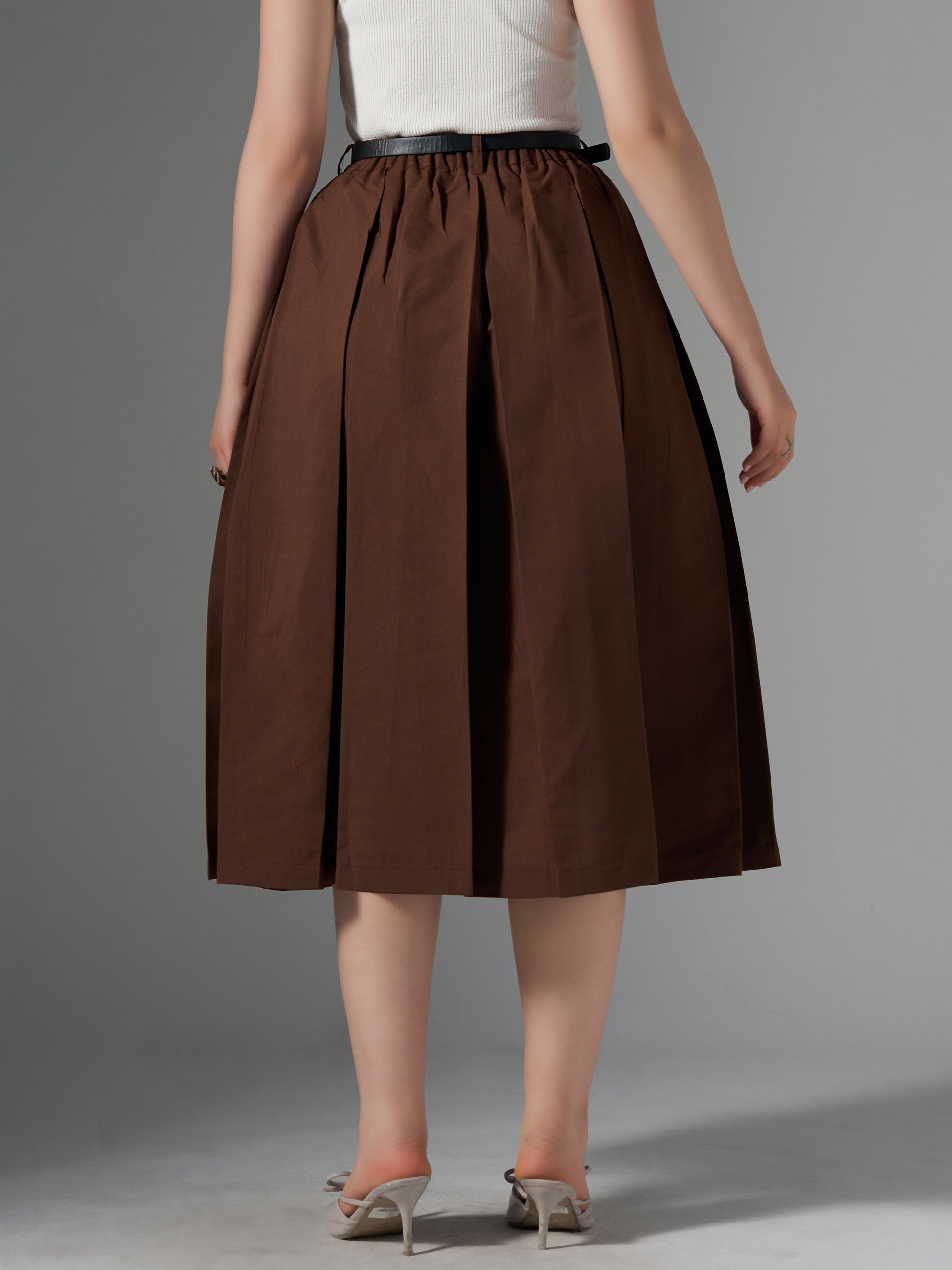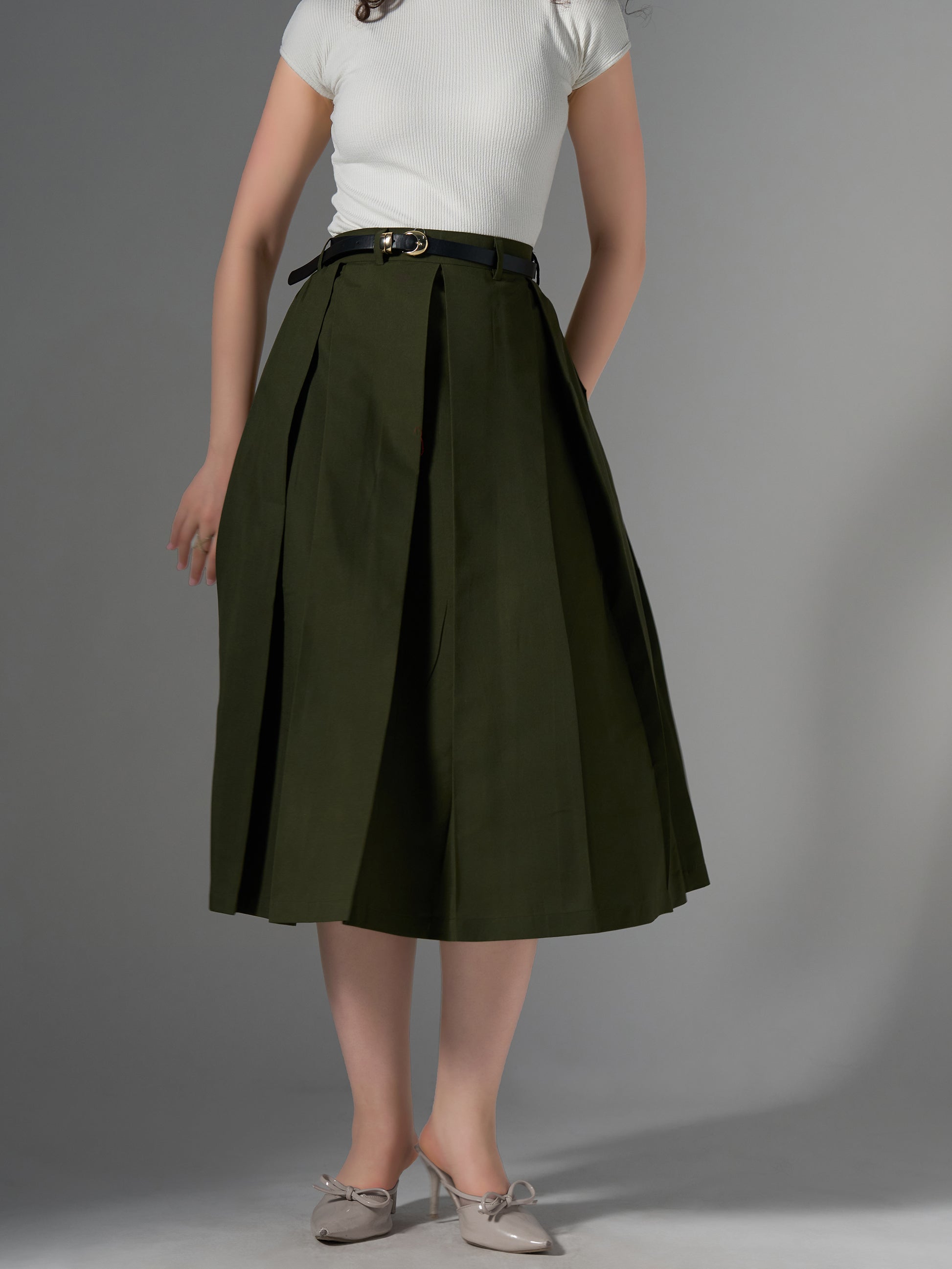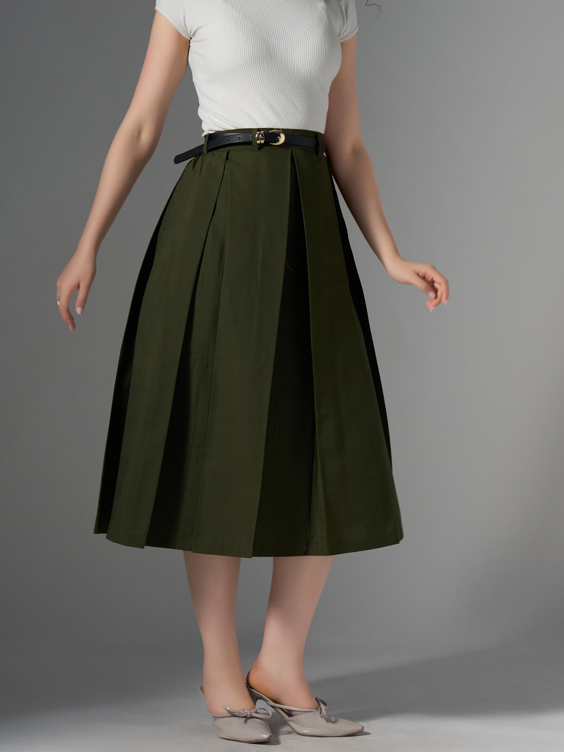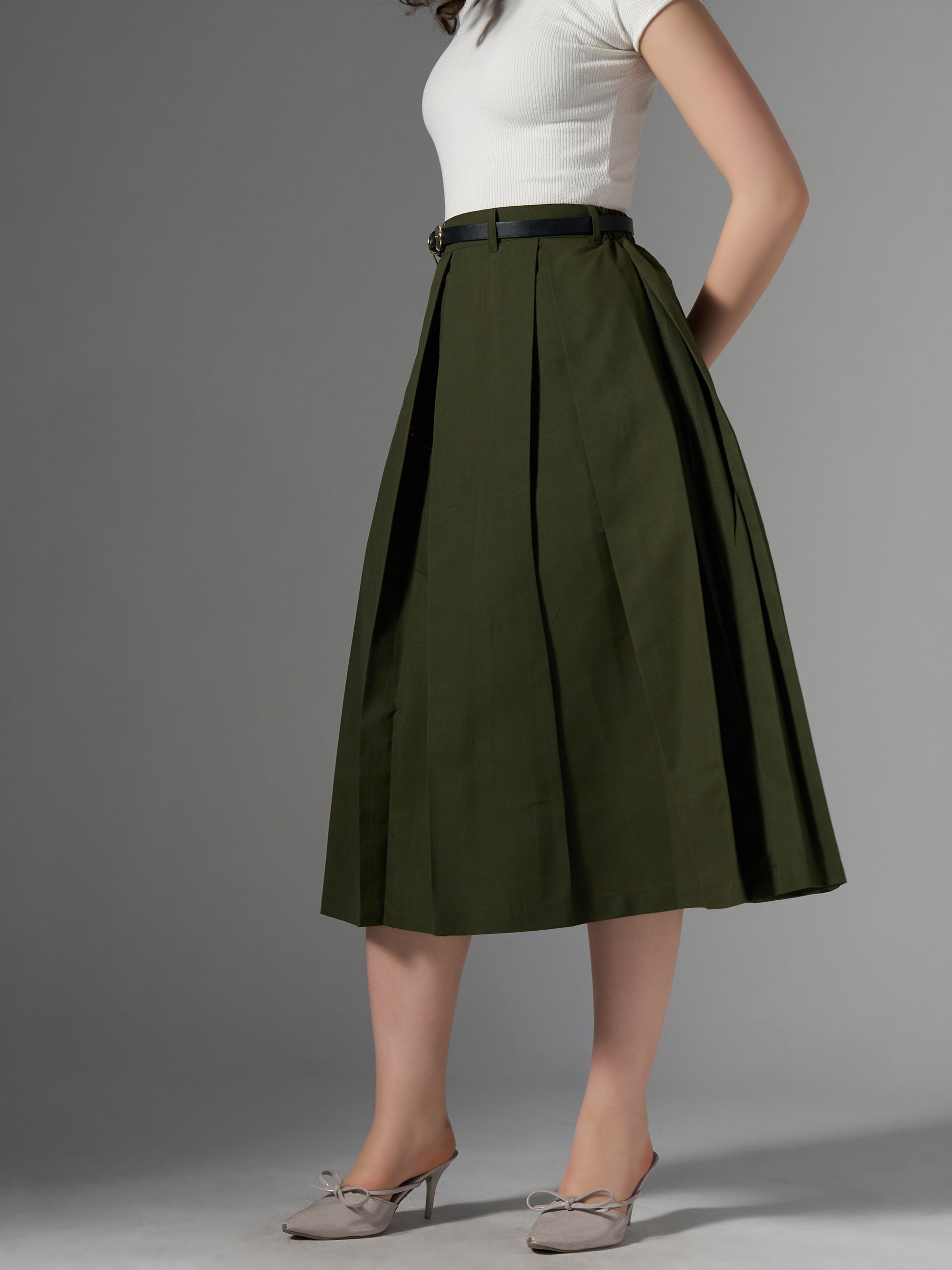 Cotton Midi Flared Pleated Skirt With Belt Loop