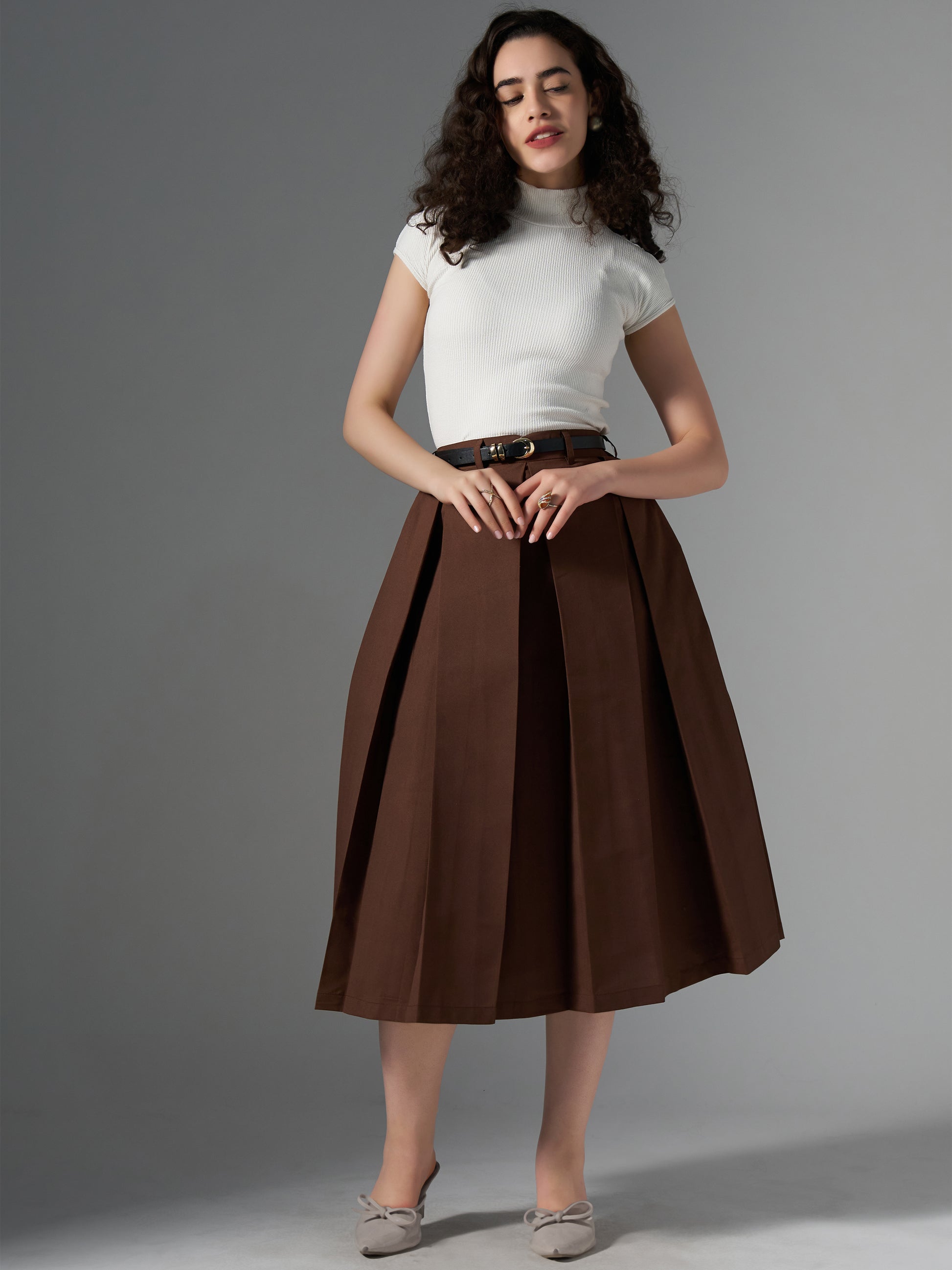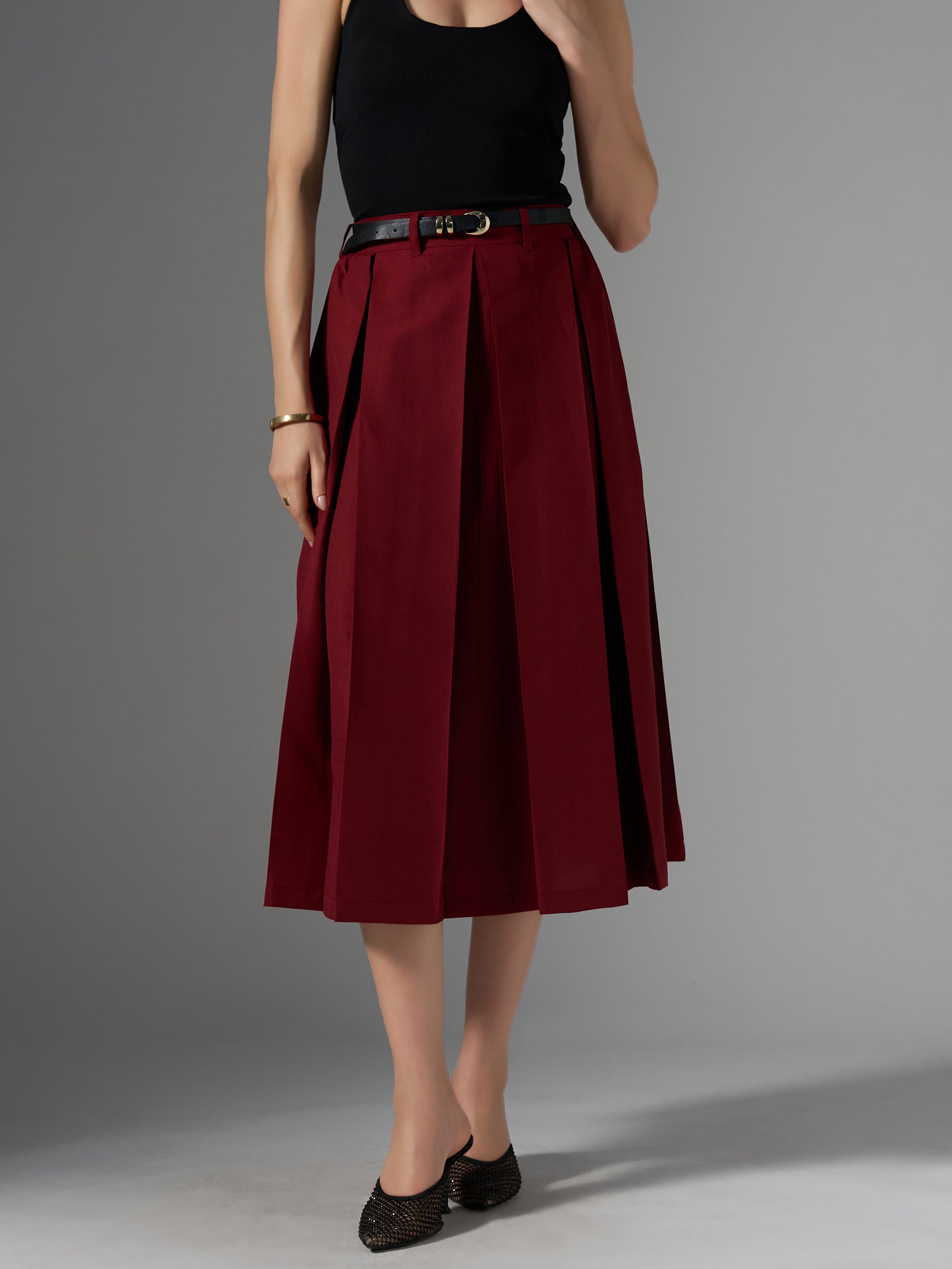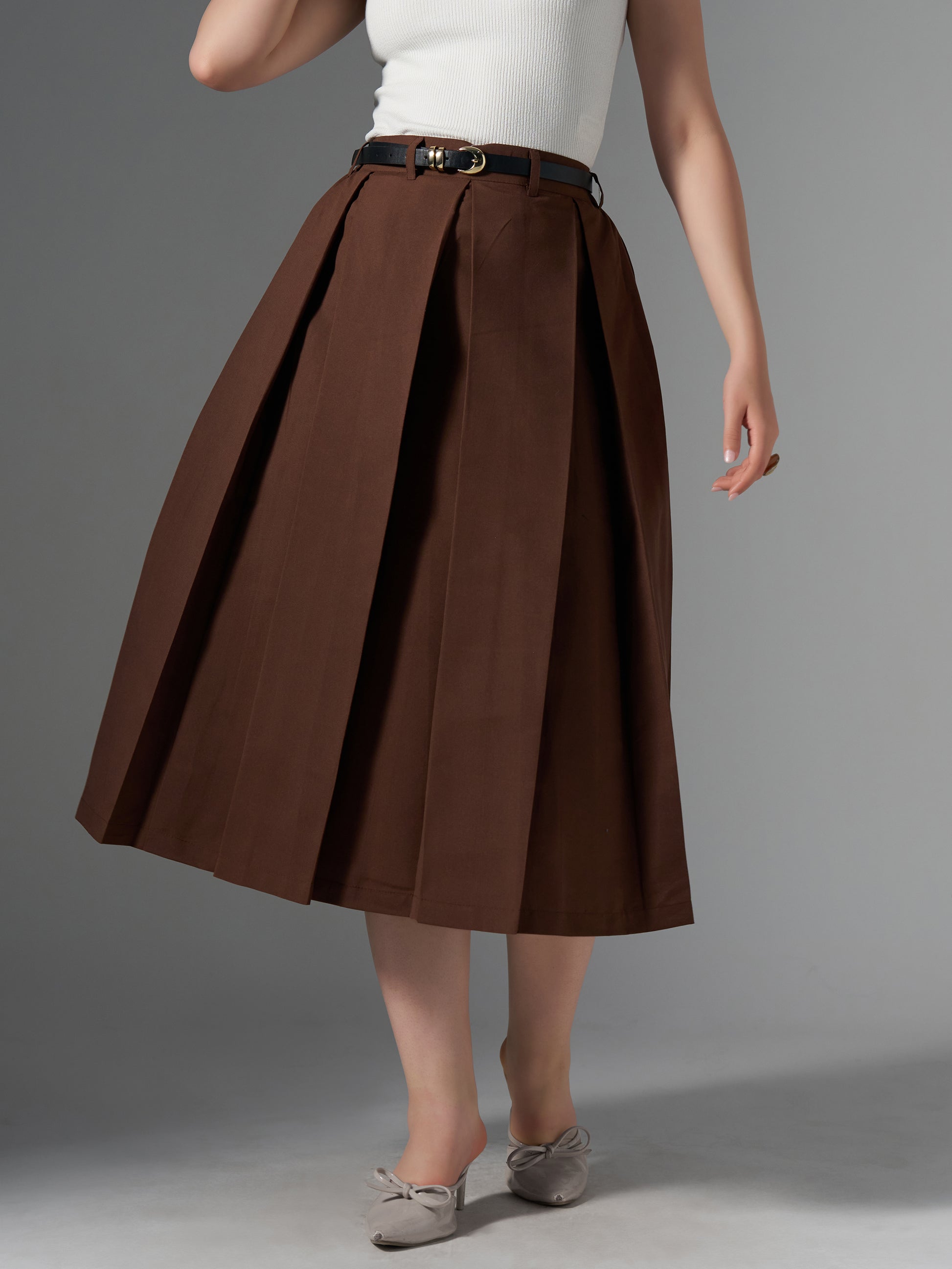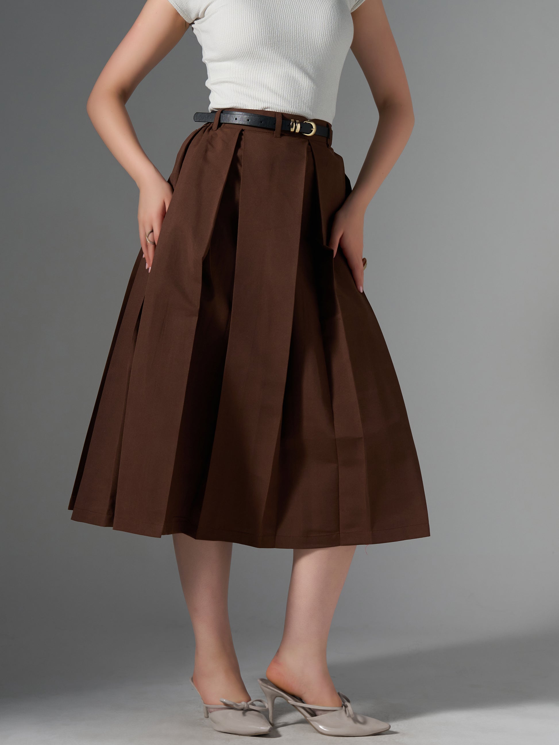 Cotton Midi Flared Pleated Skirt With Belt Loop