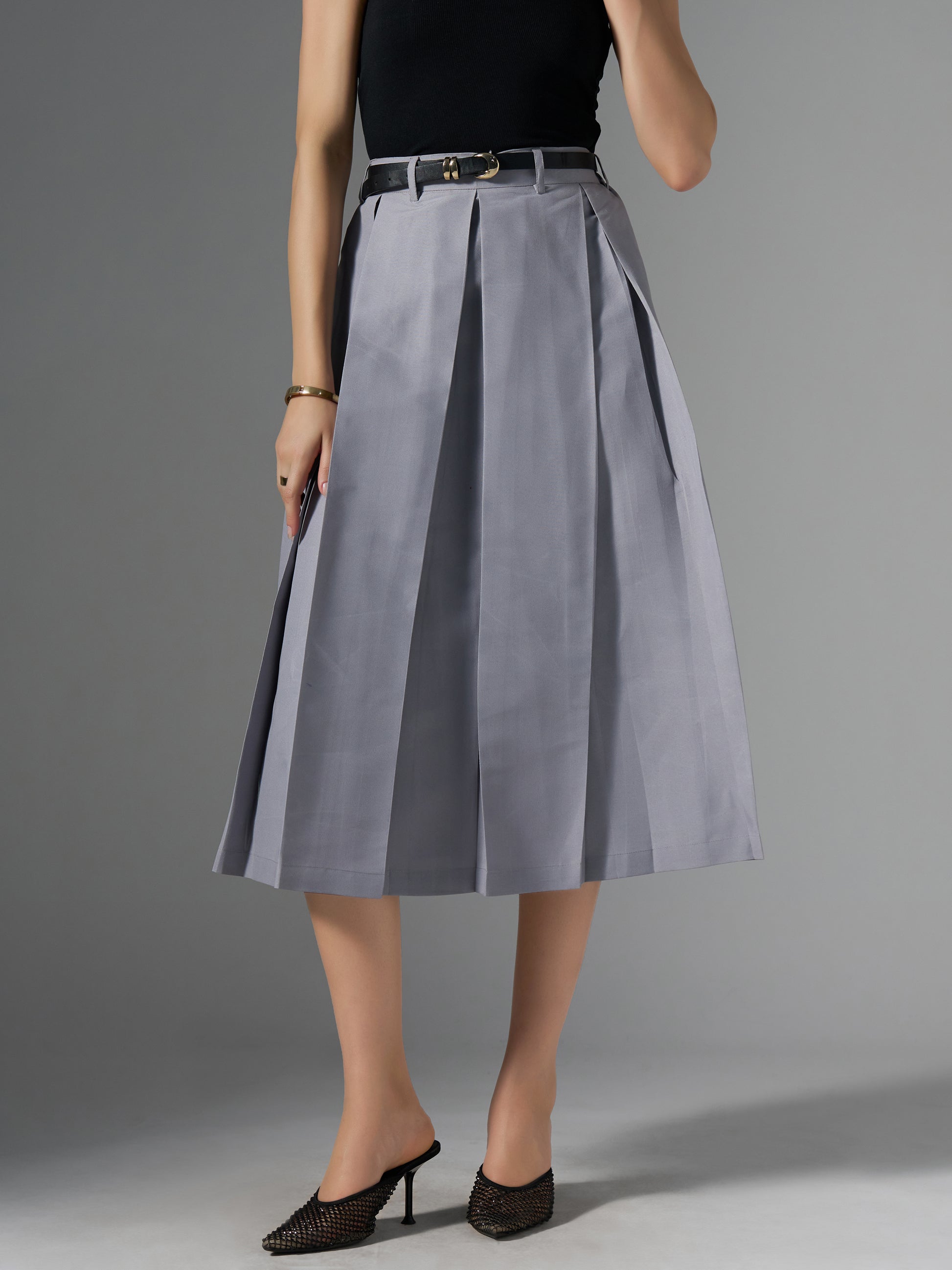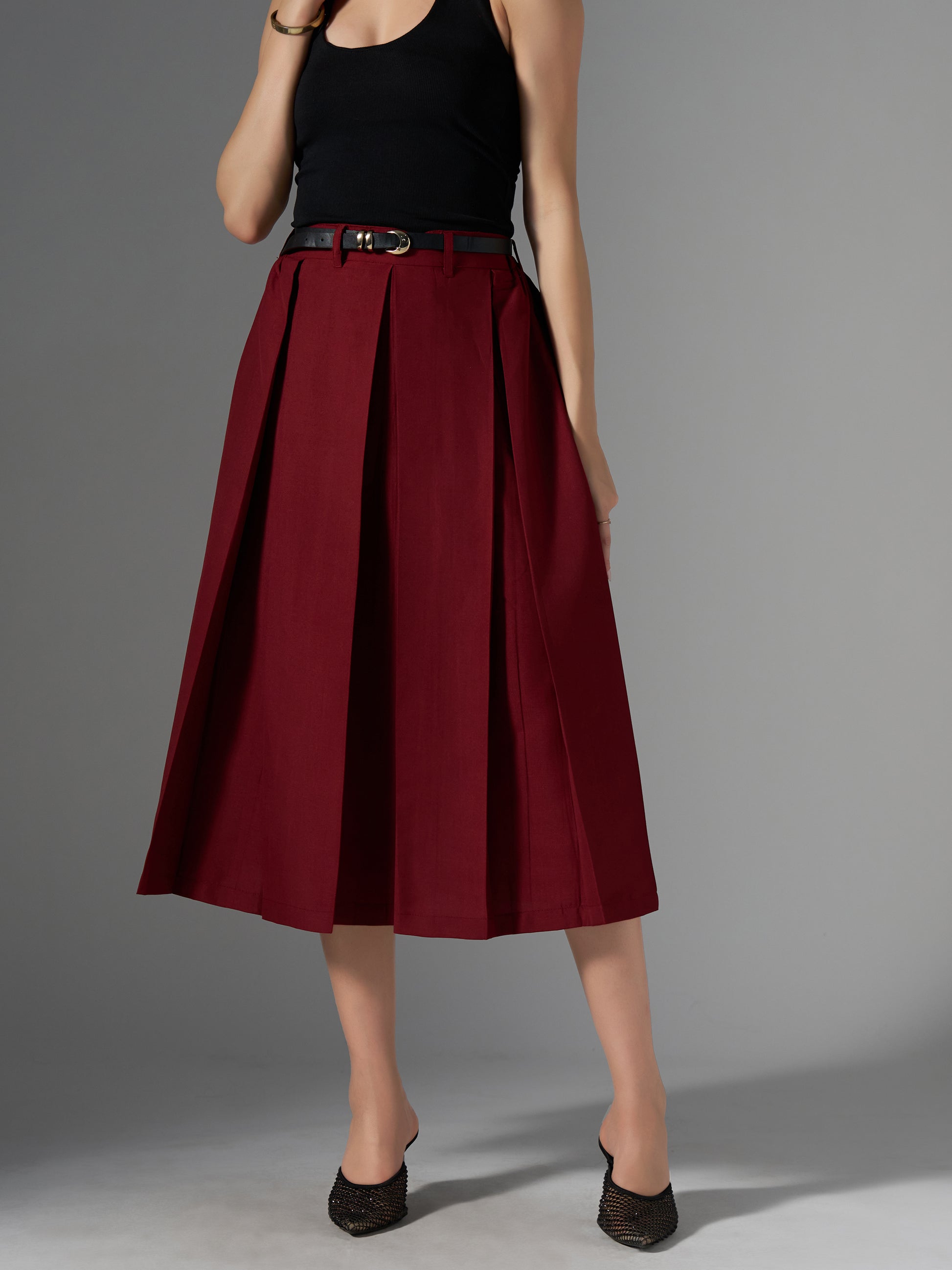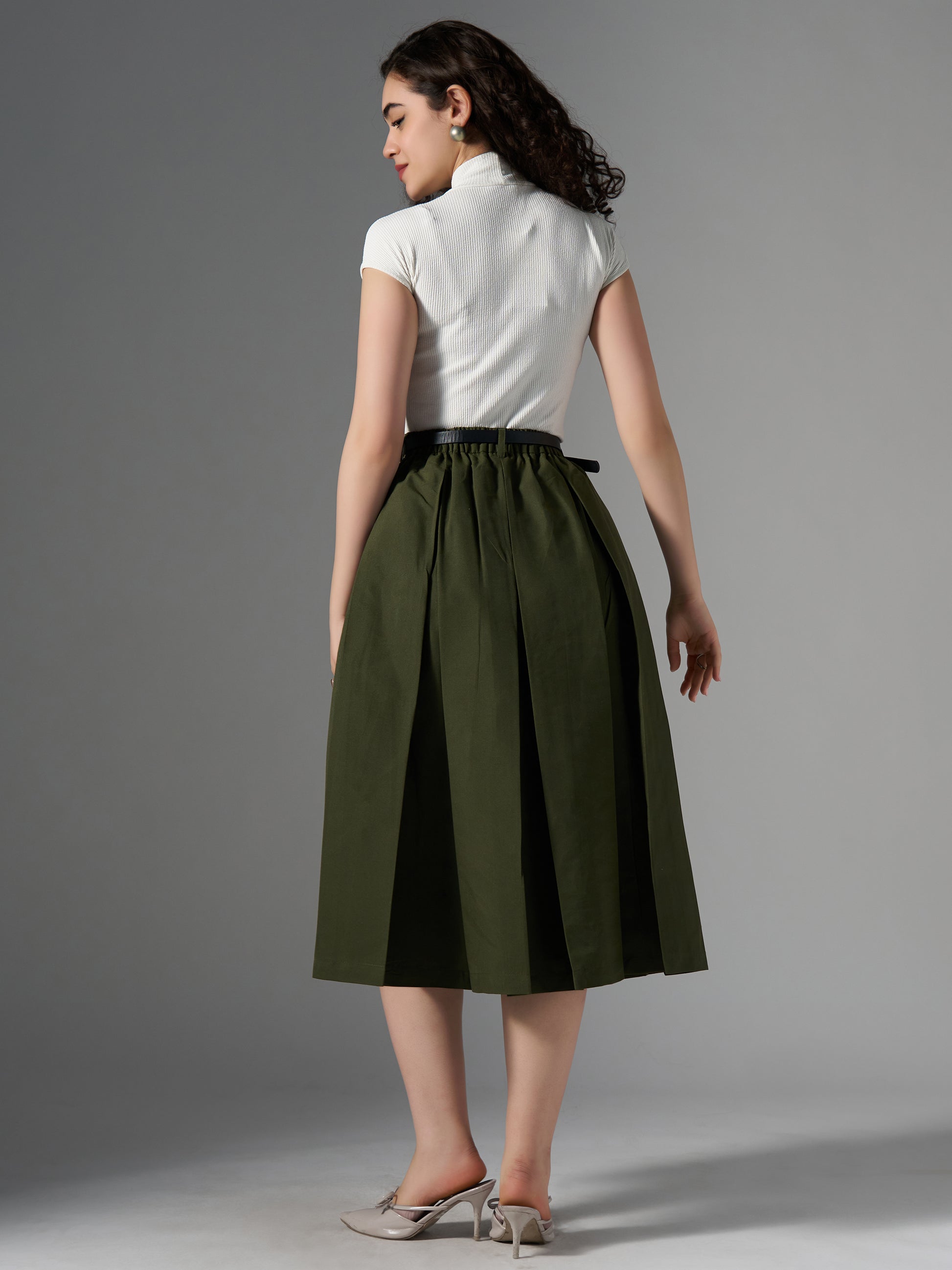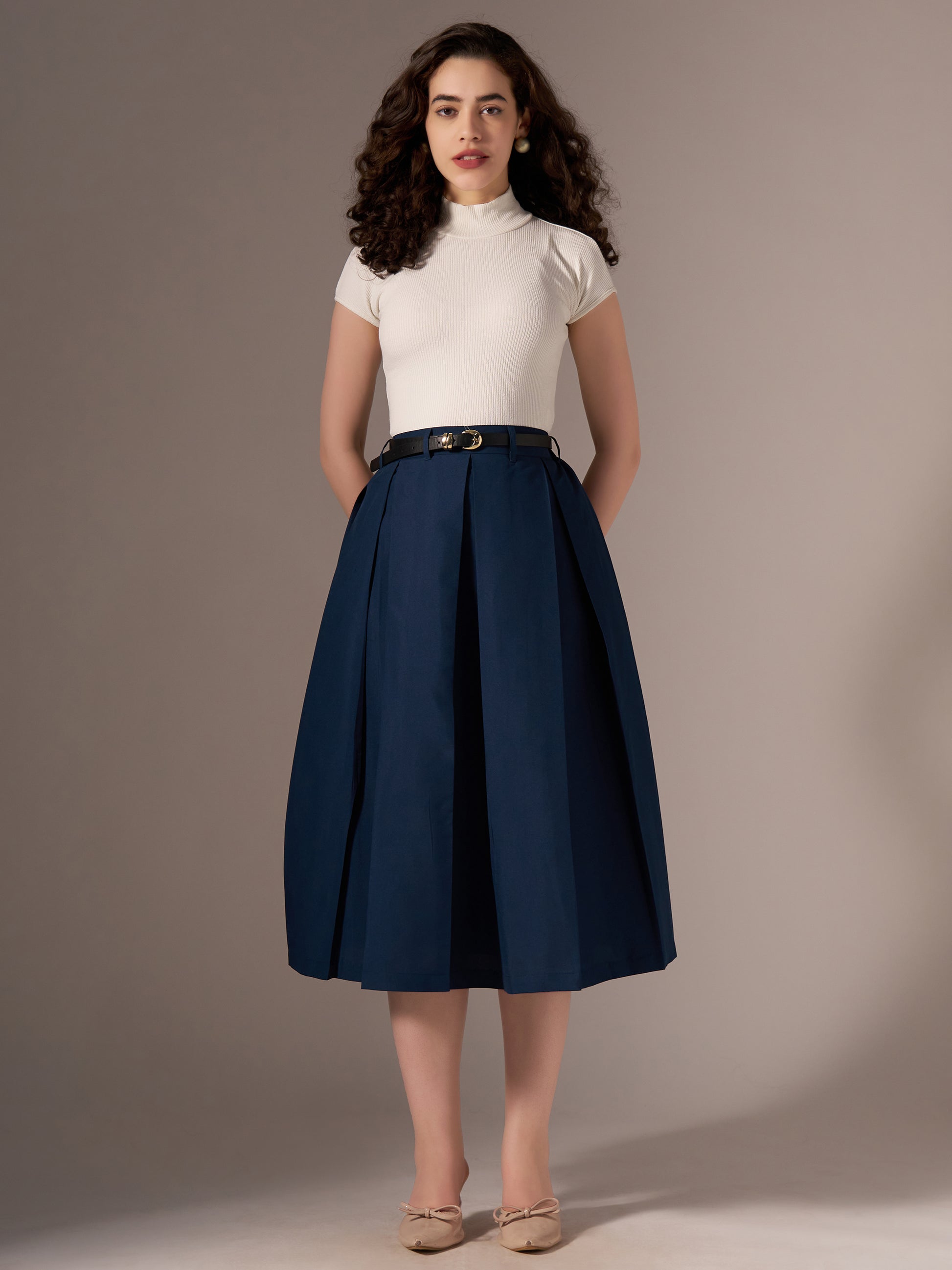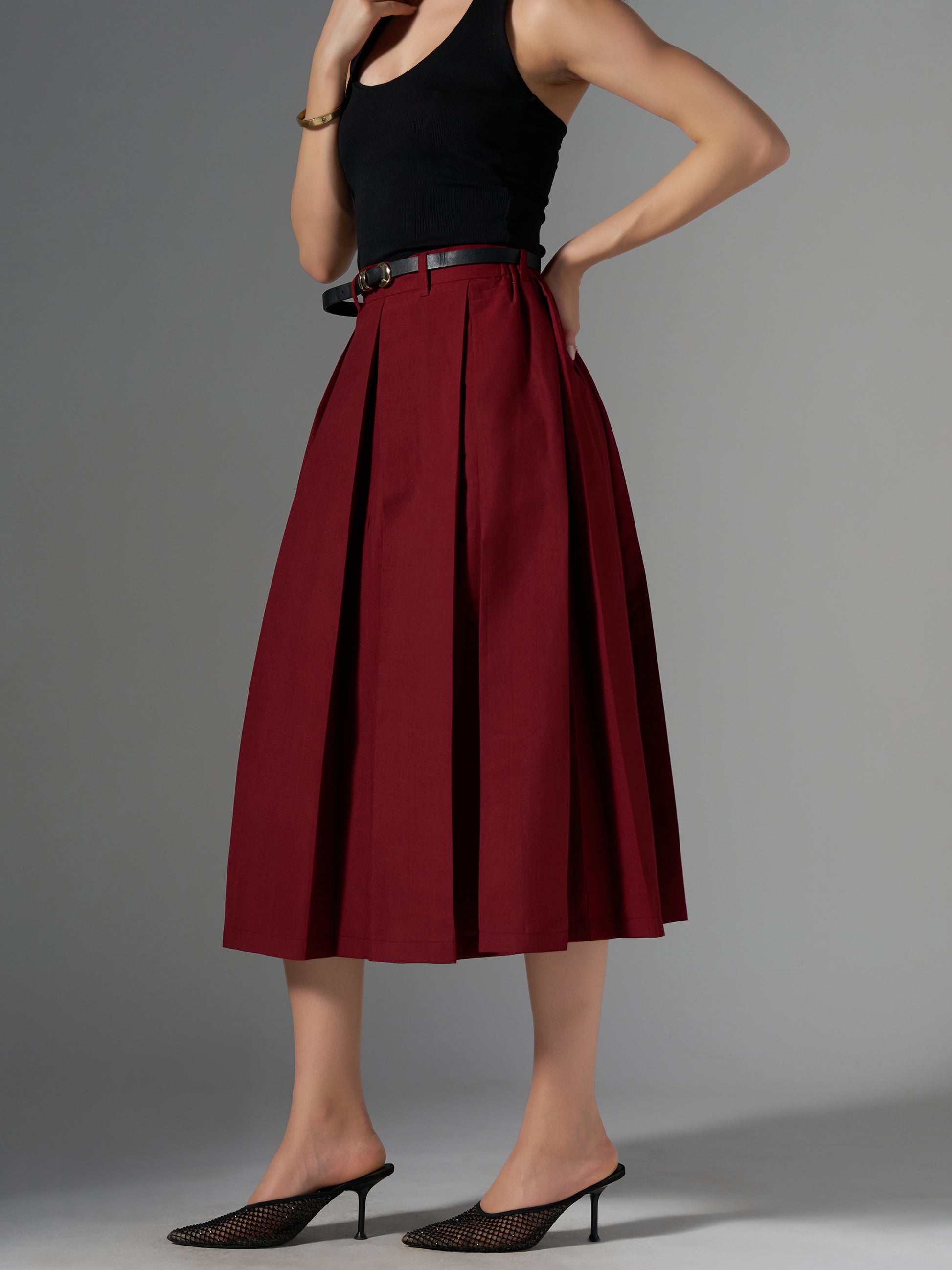 Cotton Midi Flared Pleated Skirt With Belt Loop