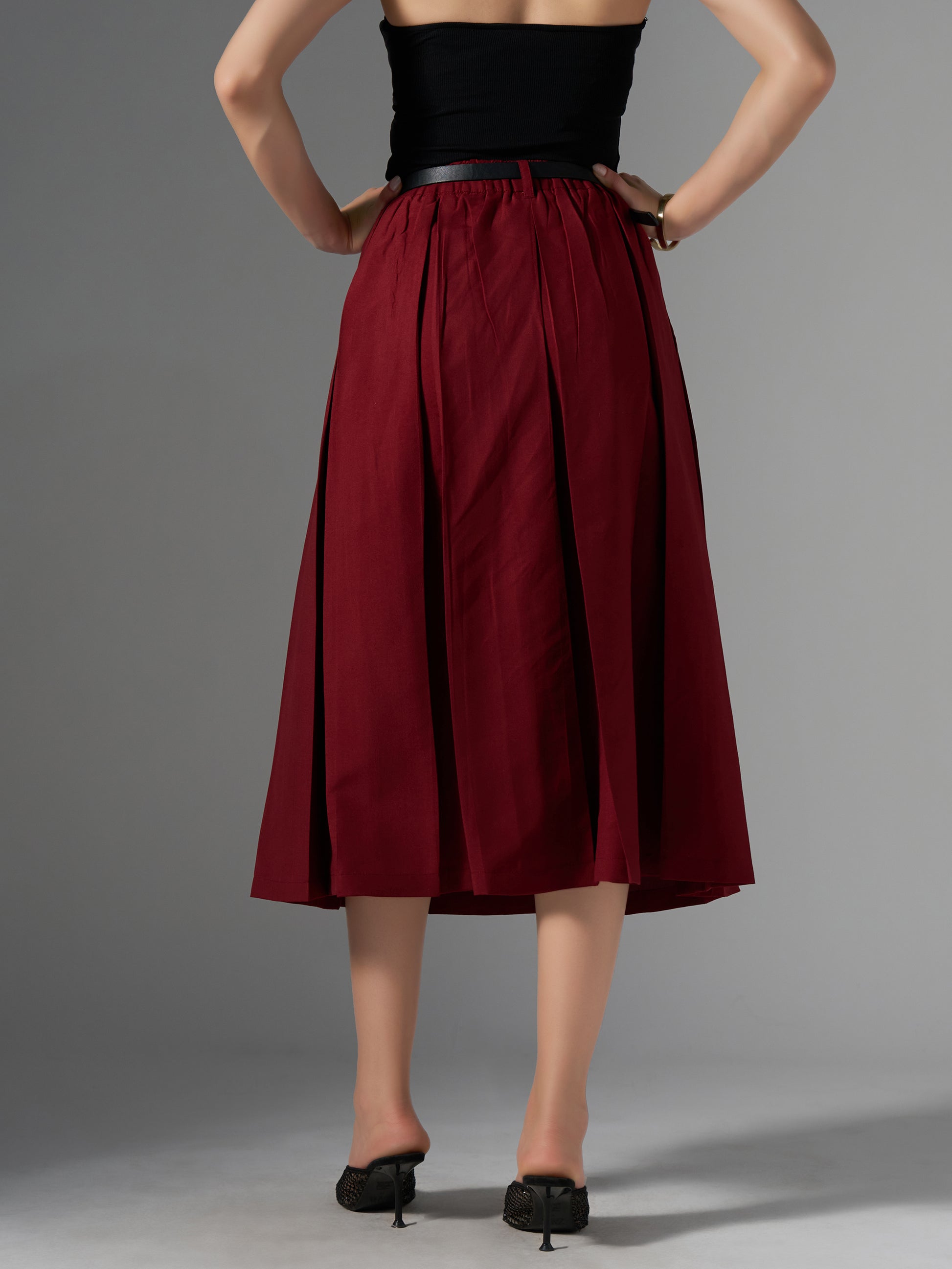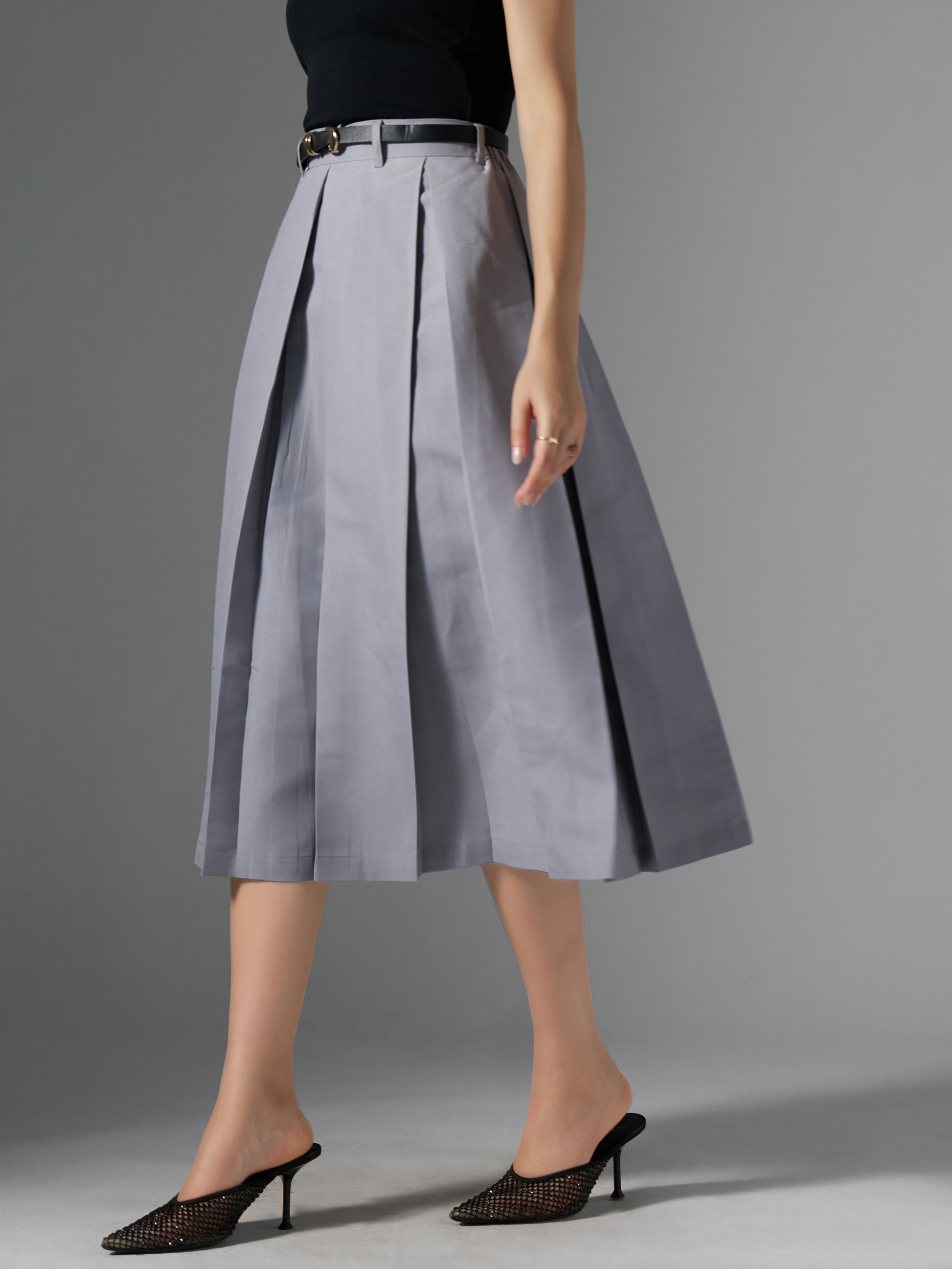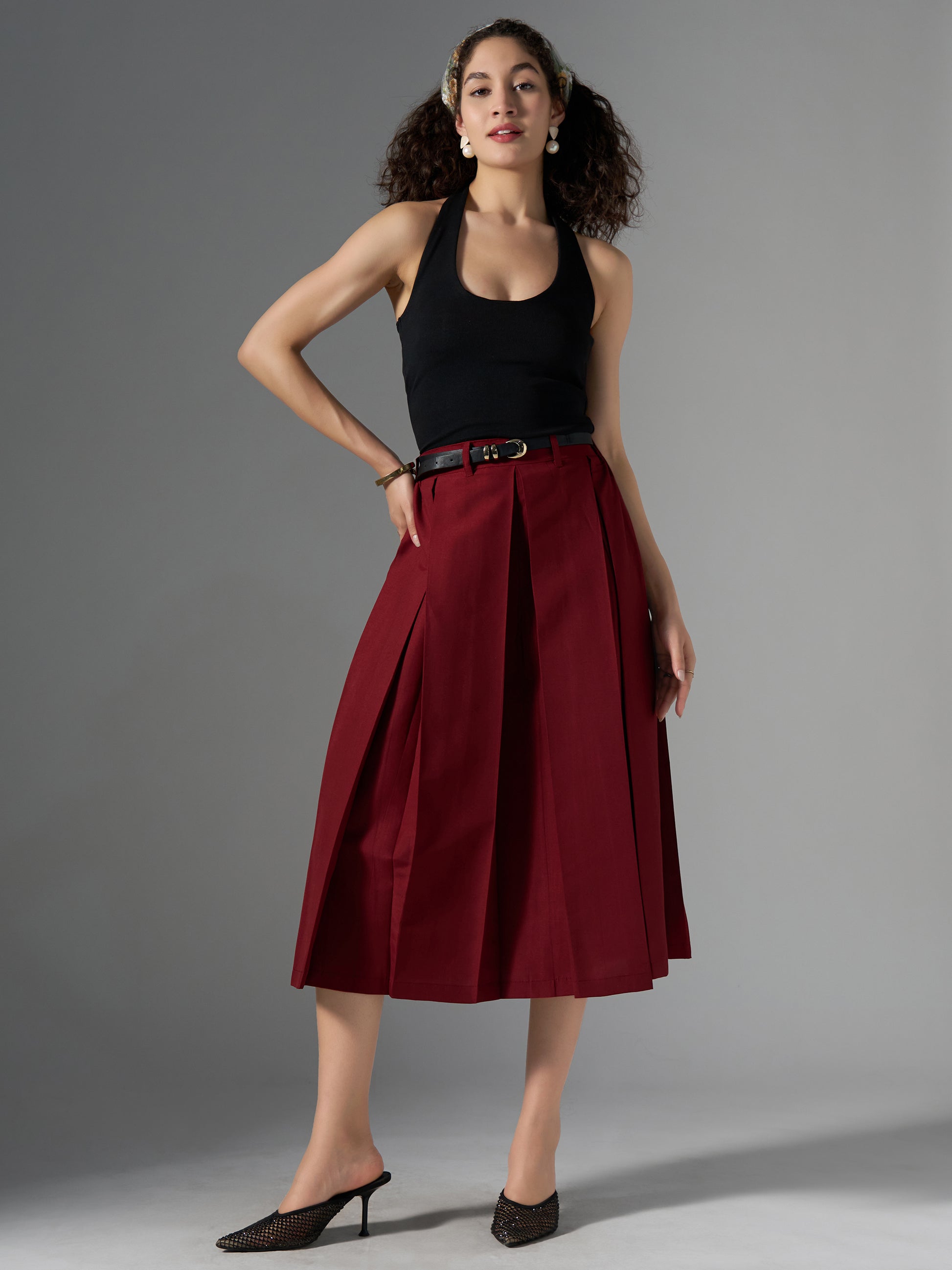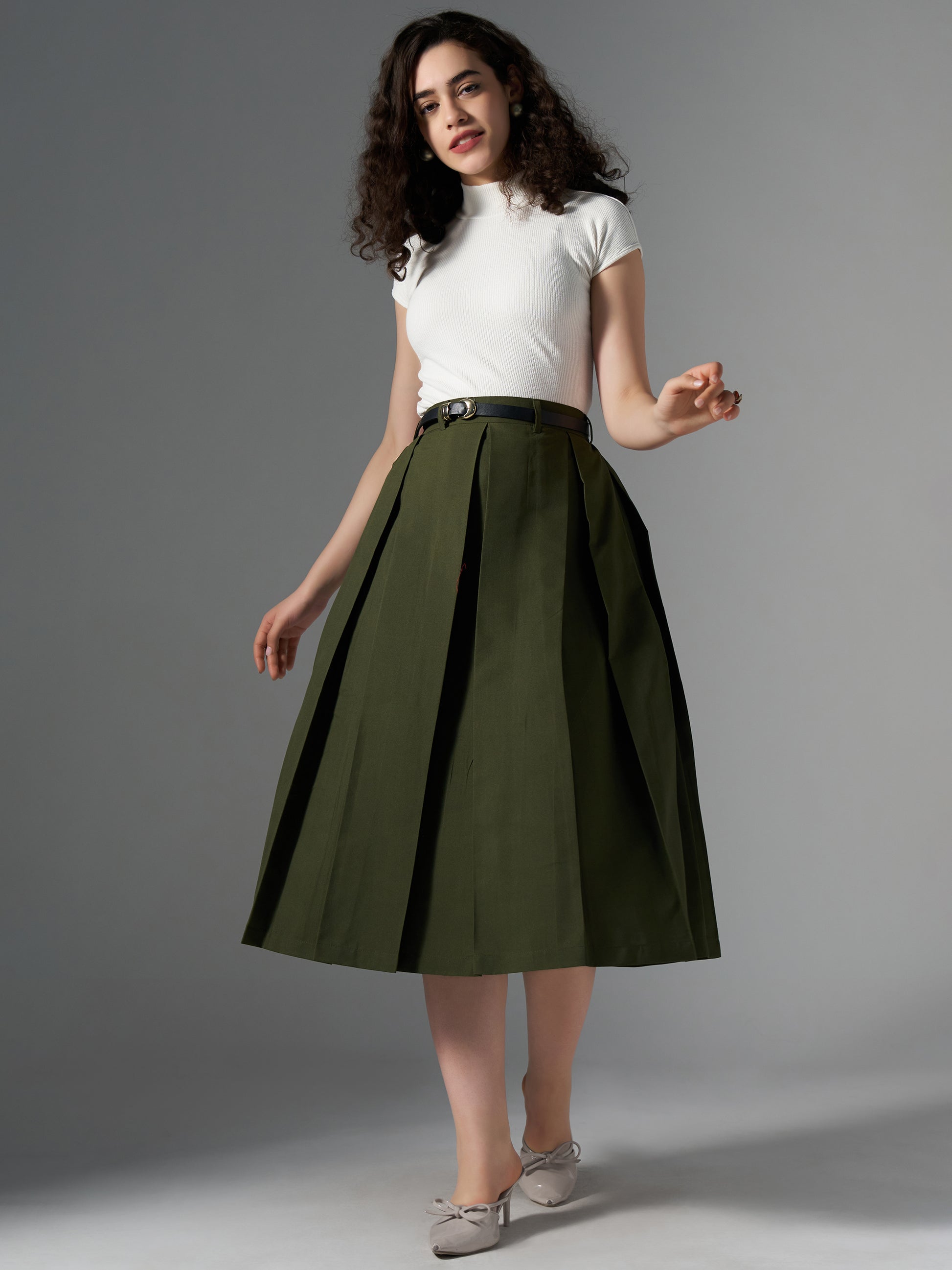 Cotton Midi Flared Pleated Skirt With Belt Loop