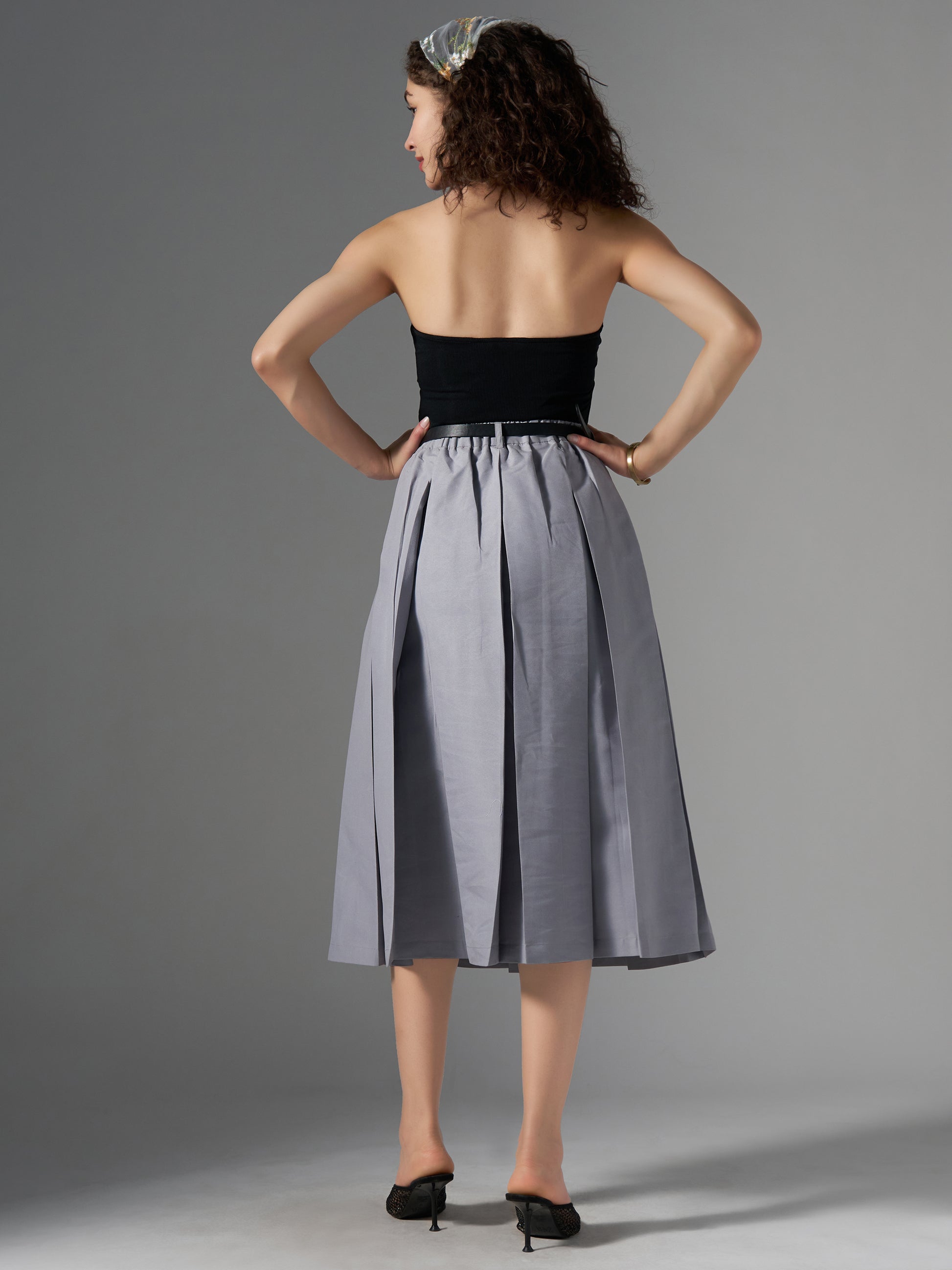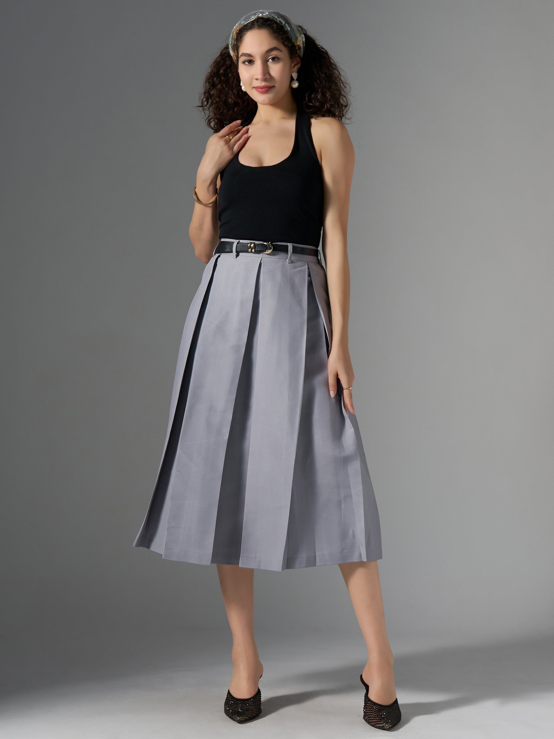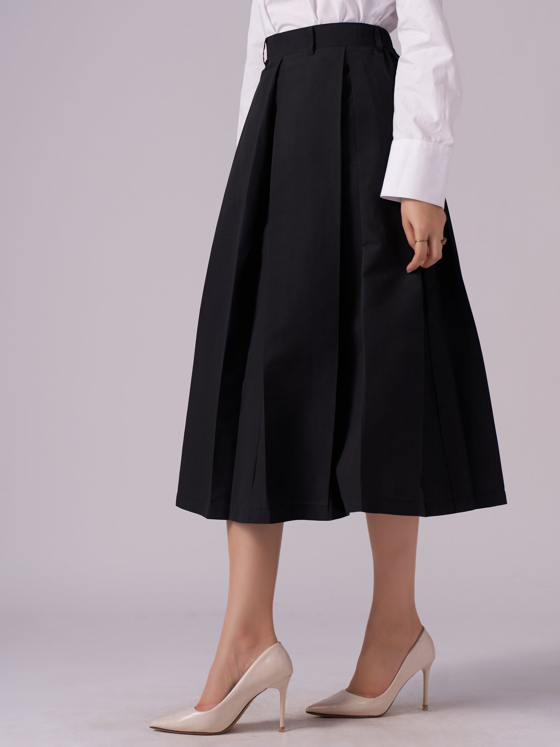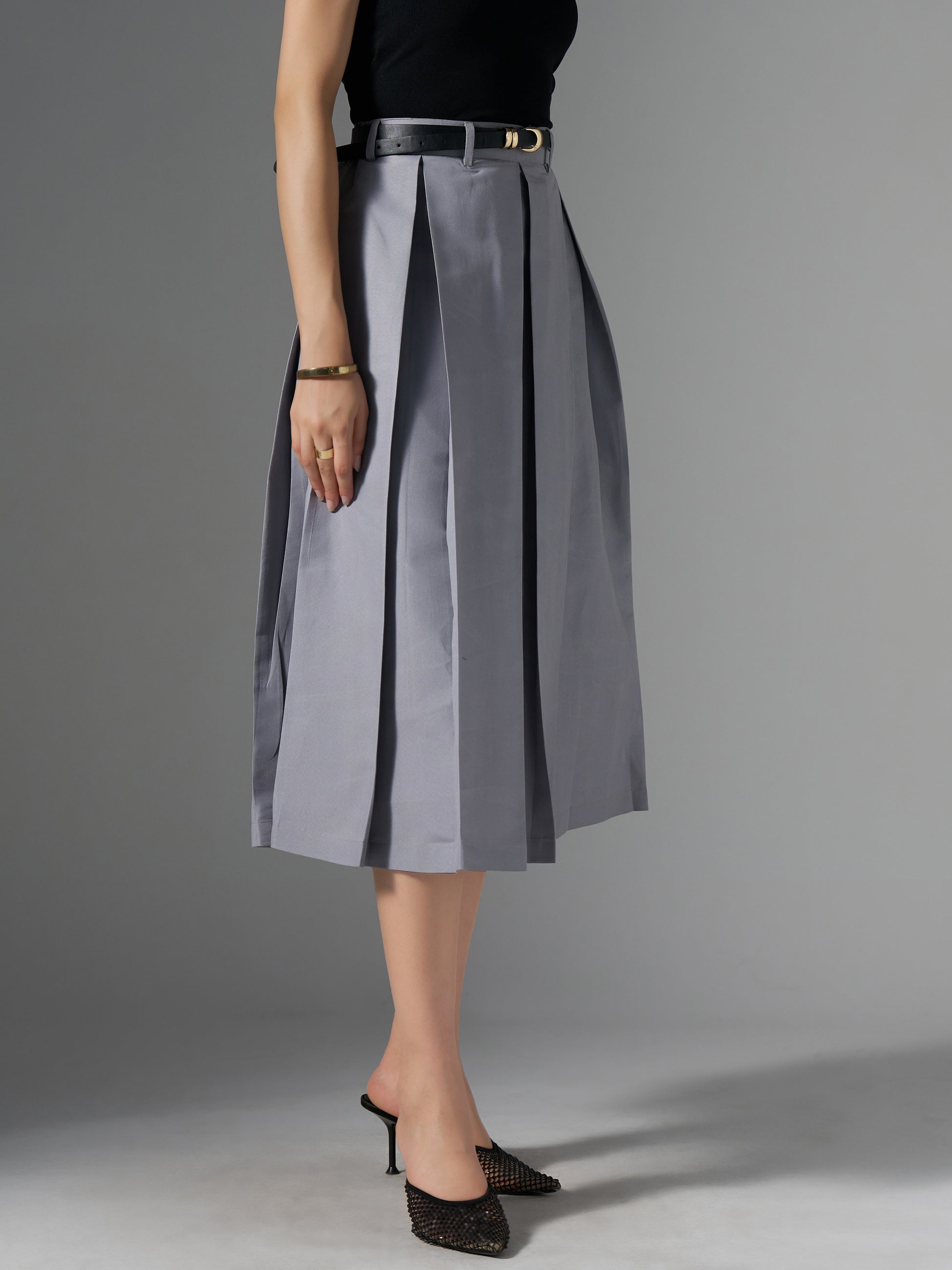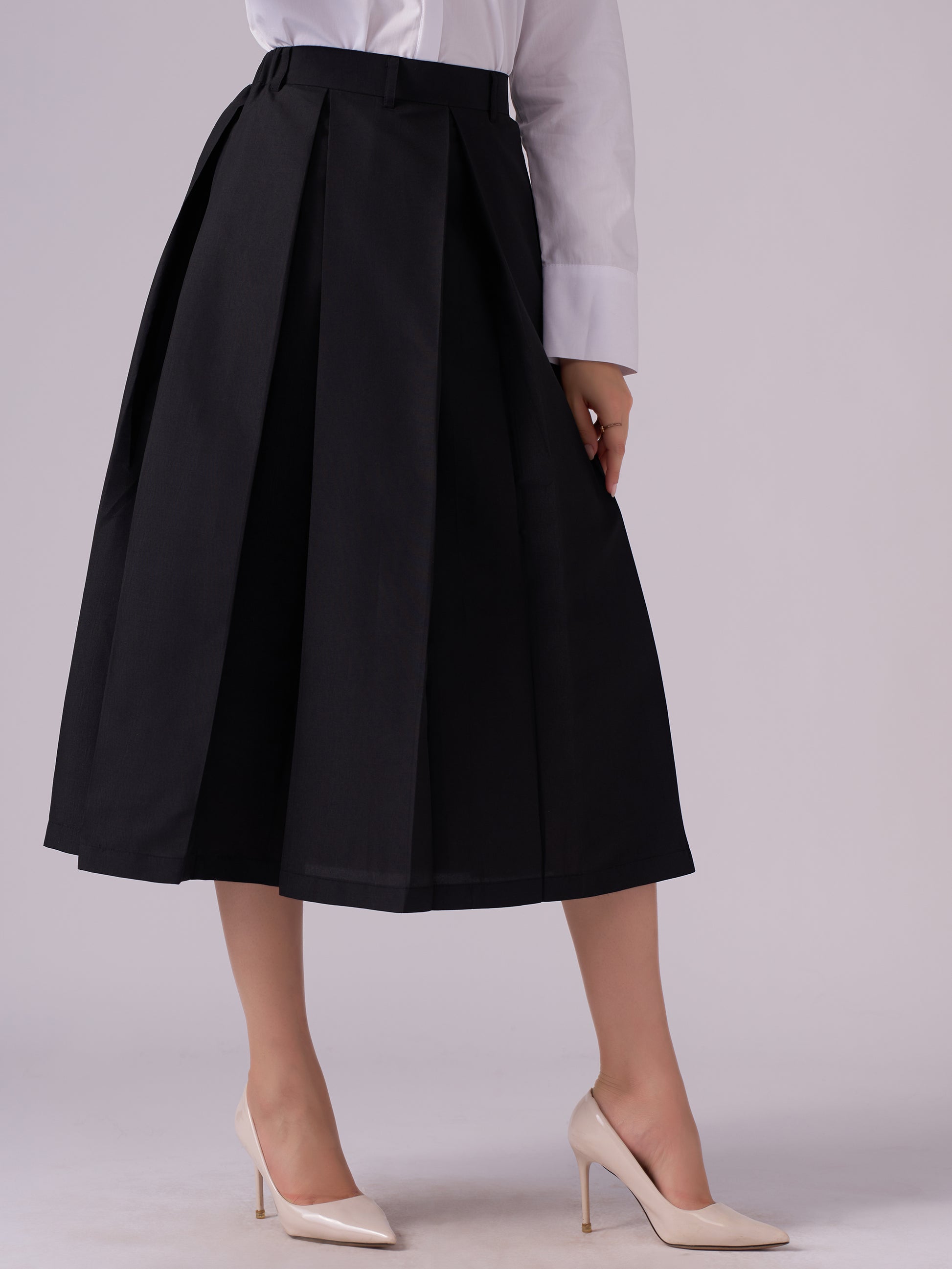 Cotton Midi Flared Pleated Skirt With Belt Loop